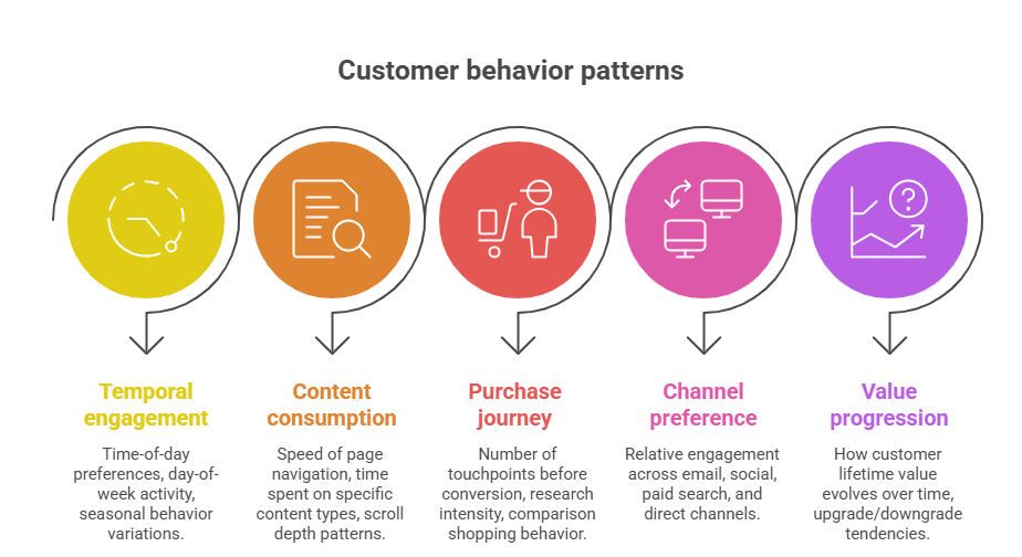 - Temporal engagement patterns: Time-of-day preferences, day-of-week activity, seasonal behavior variations