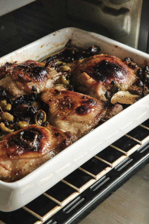 - In a large bowl, combine the minced garlic, dried oregano, kosher salt, black pepper, red wine vinegar, olive oil, prunes, olives, capers, and bay leaves. Add the chicken thighs, and massage the marinade under the skin. Cover the bowl and refrigerate overnight to let the flavors meld.