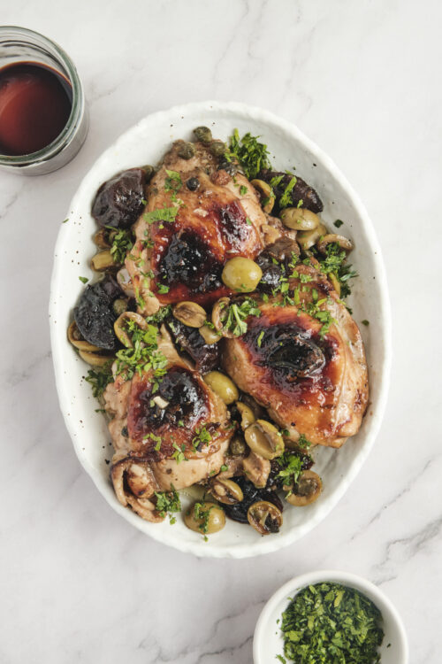 - Transfer the chicken and some of the prunes, olives, and capers from the dish to a serving platter. Discard the bay leaves and drizzle extra pan juices over the top. Garnish with chopped fresh parsley and serve hot or at room temperature.