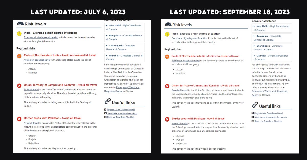 Less than a day after Prime Minister Justin Trudeau of Canada alleged that “agents of the government of India” had carried out the assassination of a Sikh independence advocate Hardeep Singh Nijjar in British Columbia in June, social media became rife with claims that the Canadian government updated its travel advisory urging citizens to exercise a high degree of caution in India due to the threat of terrorist attacks throughout the country. It also cautions against all travel to Jammu and Kashmir due to the unpredictable security situation, and non-essential travel to parts of North-eastern states like Assam and Manipur owing to the risk of terrorism and insurgency.