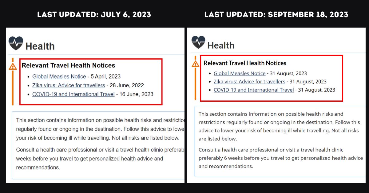 For the advantage of the reader, we have placed the ‘Health’ section from July 6 alongside the latest update on September 18. As is evident, the dates for the Global Measles Notice, Zika virus: Advice for travellers and the notice for COVID-19 and International Travel have clearly changed.