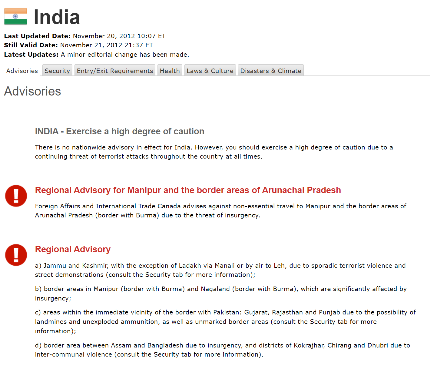Moreover, it is worth noting that similar advisories have been issued for over a decade now, dating as far back as November 2012. According to the 2012 advisory, Canadian citizens were urged to ‘exercise a high degree of caution due to the continuing threat of terrorist attacks throughout the country at all times’. The 2012 advisory, too, cautioned against non-essential travel to Manipur and the border areas of Arunachal Pradesh (border with Burma) due to the ‘threat of insurgency’. There was a regional advisory against travelling to Jammu and Kashmir (due to ‘sporadic terrorist violence and street demonstrations’) and areas within the immediate vicinity of the border with Pakistan: Gujarat, Rajasthan and Punjab (due to the ‘possibility of landmines and unexploded ammunition’) in 2012 as well.