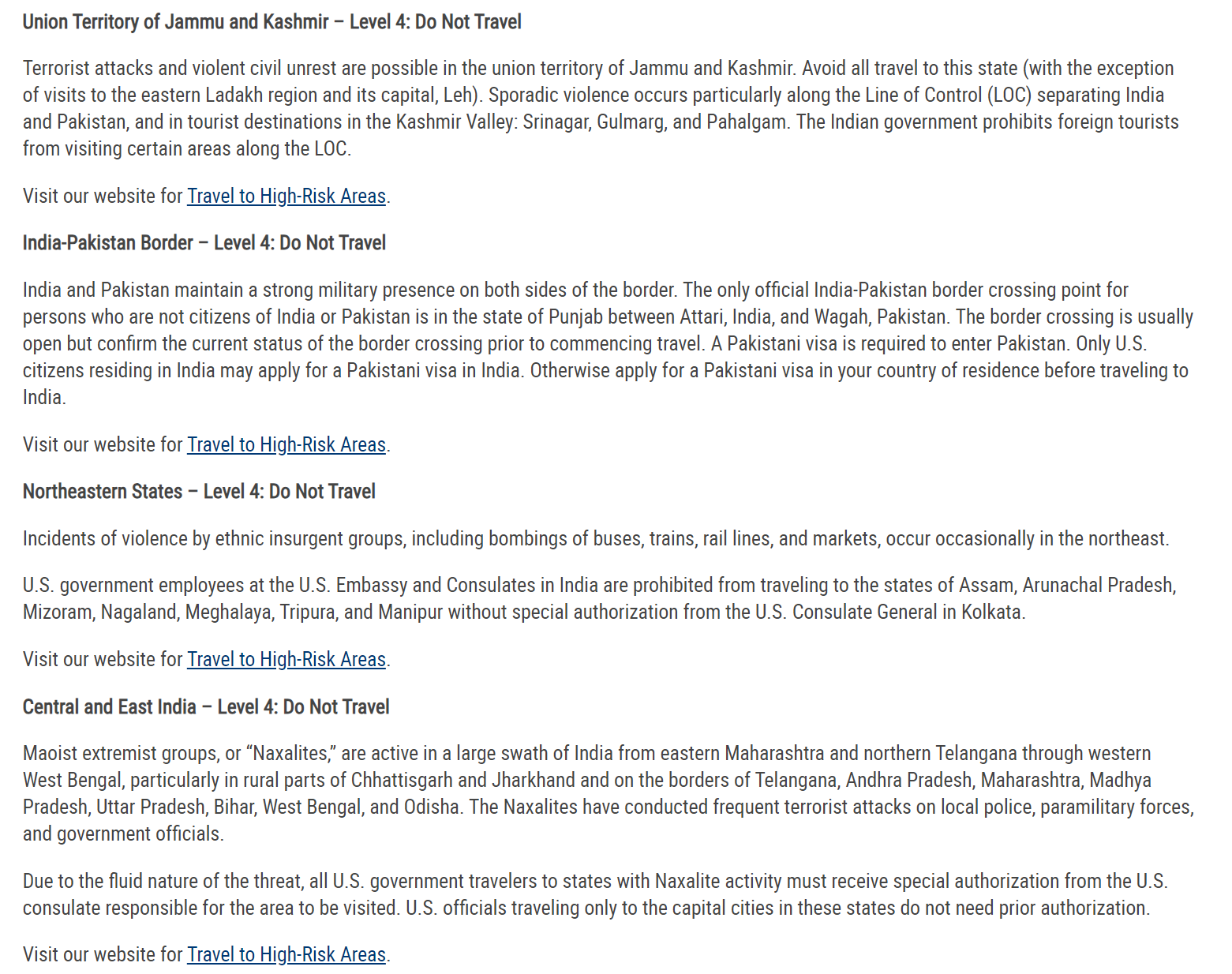We discovered that the USA has also issued a similar travel advisory cautioning against travel in Jammu and Kashmir, North-Eastern states and India-Pakistan Border. It further advises US citizens against travelling to Central and East India owing the activity of ‘Maoist extremist groups, or “Naxalites”‘ which are active in places like eastern Maharashtra and northern Telangana through western West Bengal, particularly in rural parts of Chhattisgarh and Jharkhand and on the borders of Telangana, Andhra Pradesh, Maharashtra, Madhya Pradesh, Uttar Pradesh, Bihar, West Bengal, and Odisha.