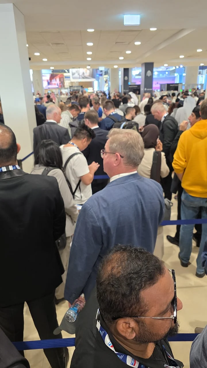 Visitors are lining up to enter the Dubai Airshow, some on their phones, some talking to colleagues and other people in the queue. The first day of the Airshow has already started with a strong turnout.