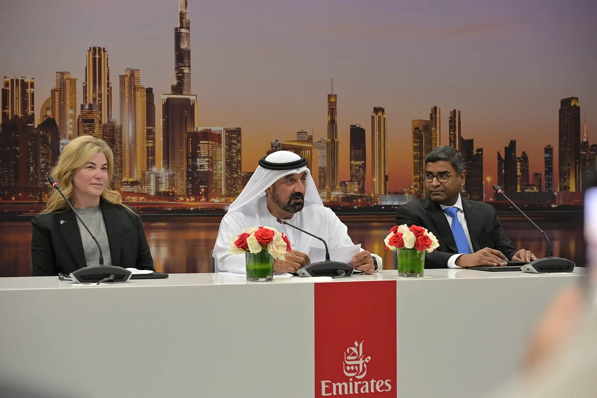 Sir Tim Clark, president of Emirates, and other senior officials attended the press conference to announce the deal