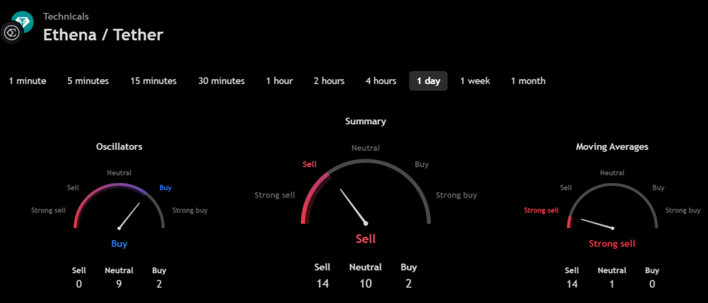 The technical analysis indicators such as Relative Volume (RVOL), Moving Average (MA), and Relative Strength Index (RSI) of Ethena (ENA) are shown in the chart below.