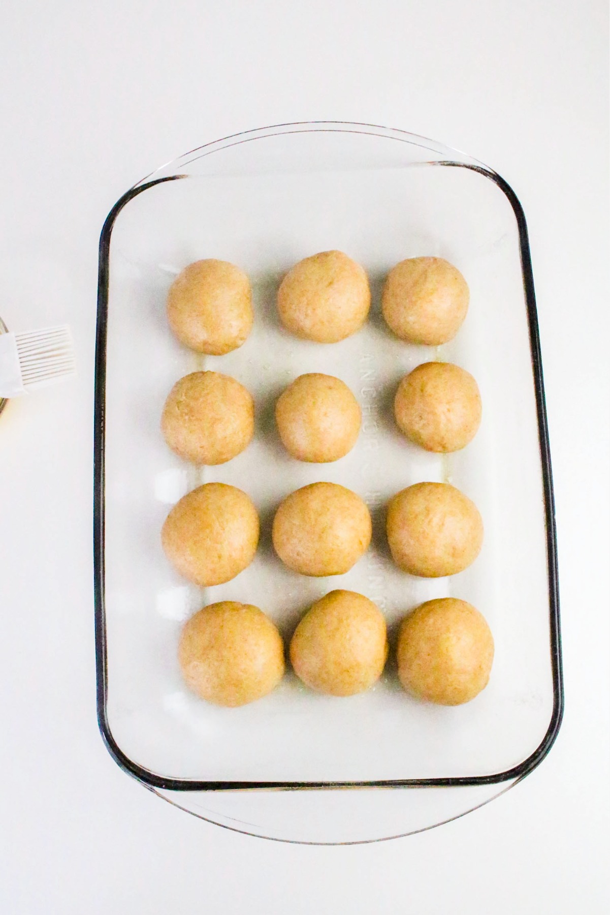 Divide the dough into 12 equal pieces. Shape into balls and place in a greased 9×13-inch baking dish.