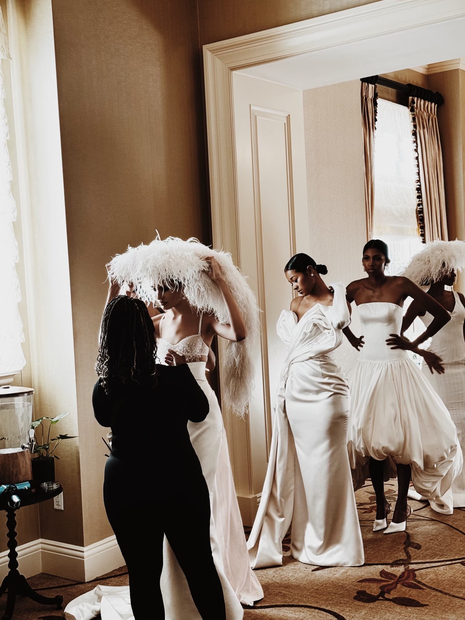The show began around 5 p.m. that evening and took place under a white whimsical wedding-style tent that was erected on the resort’s bellowing green grounds. Once it started, the models were met with “oohs” and “ahhs” as they showcased Mvuemba’s wide range of beautiful bridal looks. It was clear that the designer had every type of bridal event in mind when creating this collection: white versions of signature Hanifa pieces; full duchess satin and tulle ball gowns; beaded and sequined sheaths; fanciful separates; sexy yet bashful bridal lingerie adorned with flowing feathers; leggy mini blazer dresses; and fluffy tutu-style skirts.