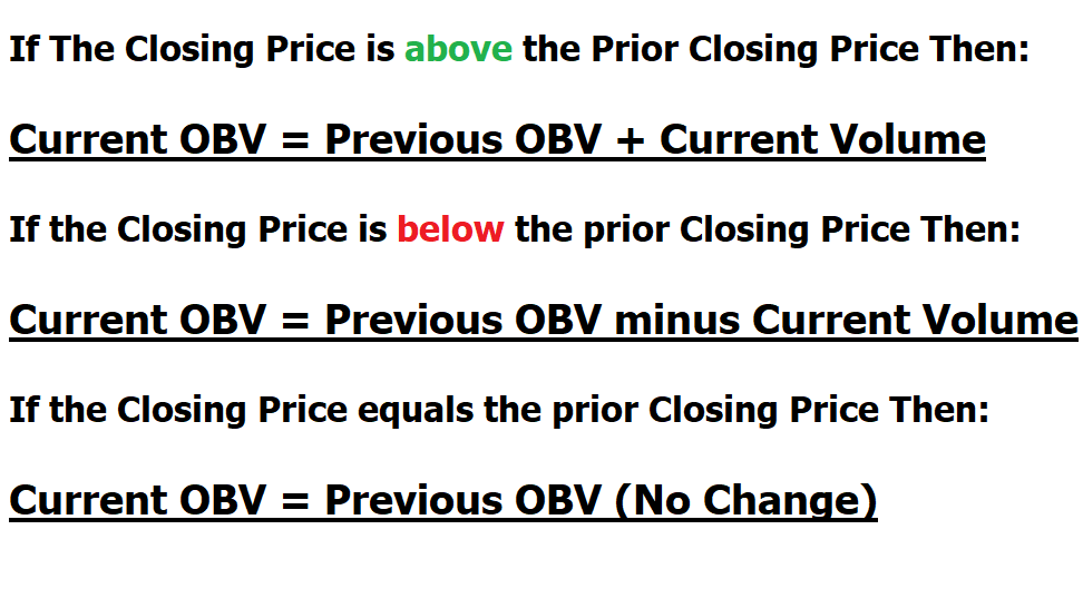 What On Balance Volume is doing is differentiating between BUYING Volume and Selling Volume.  The On Balance Volume calculation is a running total of buying volume and selling volume.  A period’s volume is considered positive when you have an up close on the asset being tracked.  A period’s volume is considered negative when the close is below the previous period’s close.