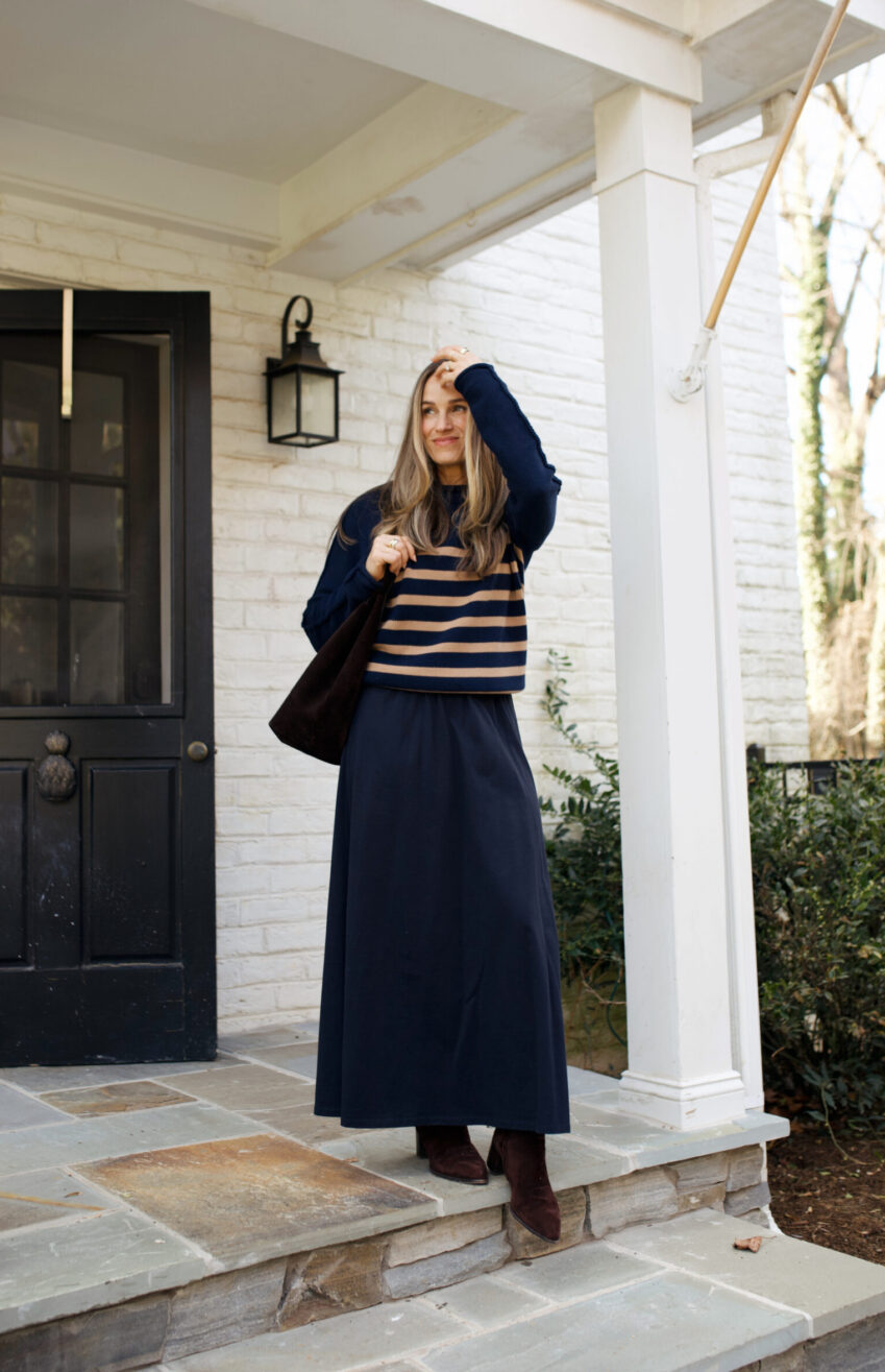 I wear sweater dresses most often with tights and tall boots, whether the dress is long or short. Ribbed or wool-blend styles like the Vivianne Dress from Tuckernuck are timeless and warm.