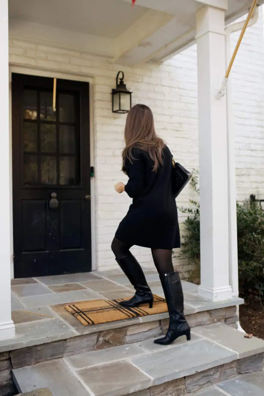 A midi dress, tights, knee-high boots, and a coat is simple but chic. Perfect for church, lunch, date night, and everything in between