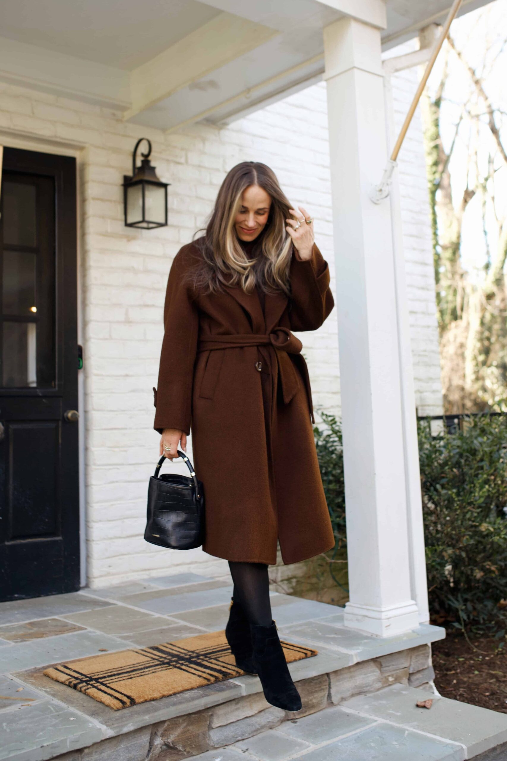 This Scarf Coat from Petite Studio I’m wearing below has taken first place in my coat selection because it’s belted, has an attachable scarf, and works with both long and short dresses.