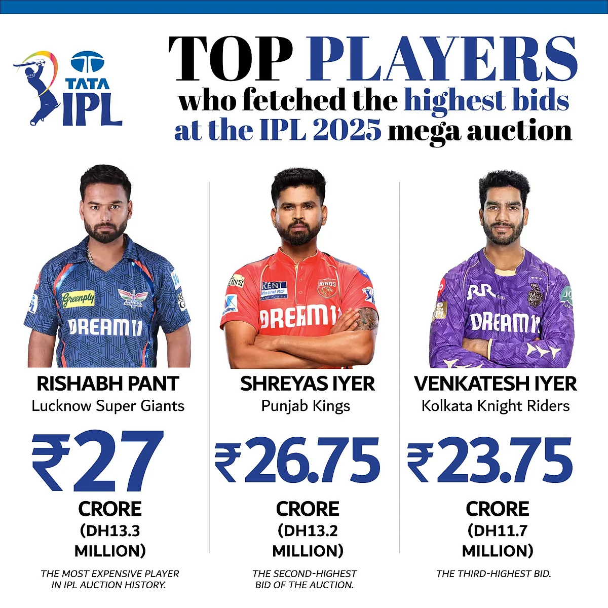 Top players who fetched the highest bids at the IPL 2025 mega auction: