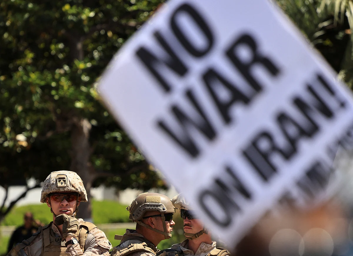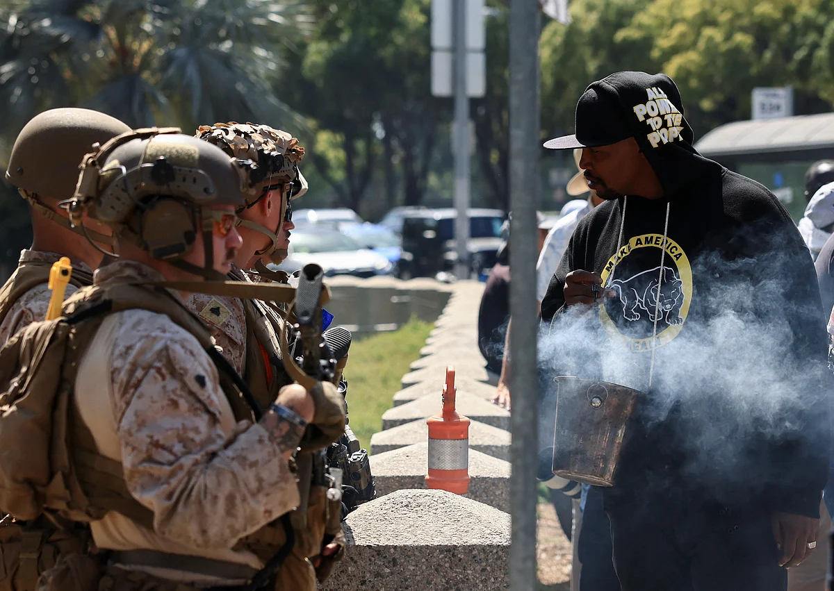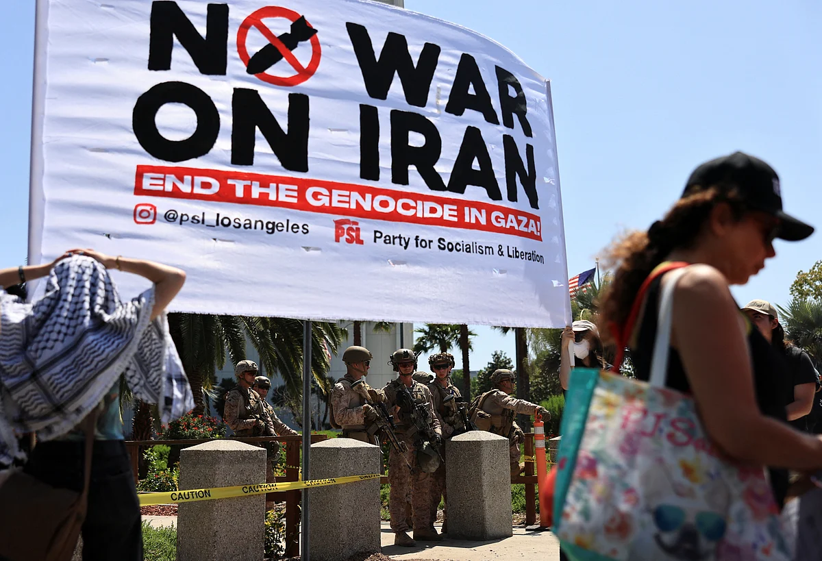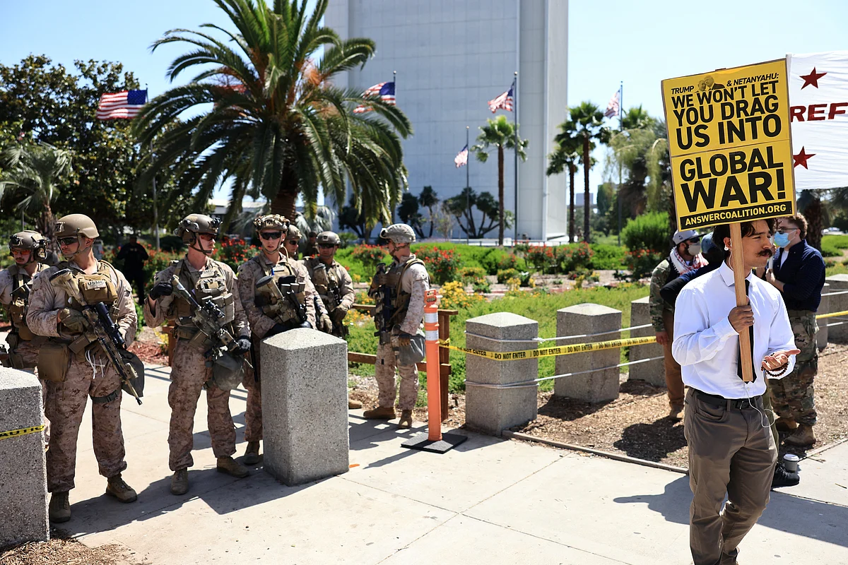 Demonstrators protest against the US joining with Israel in attacks on Iran’s nuclear facilities, as Marines stand guard at a federal building in Los Angeles, California.