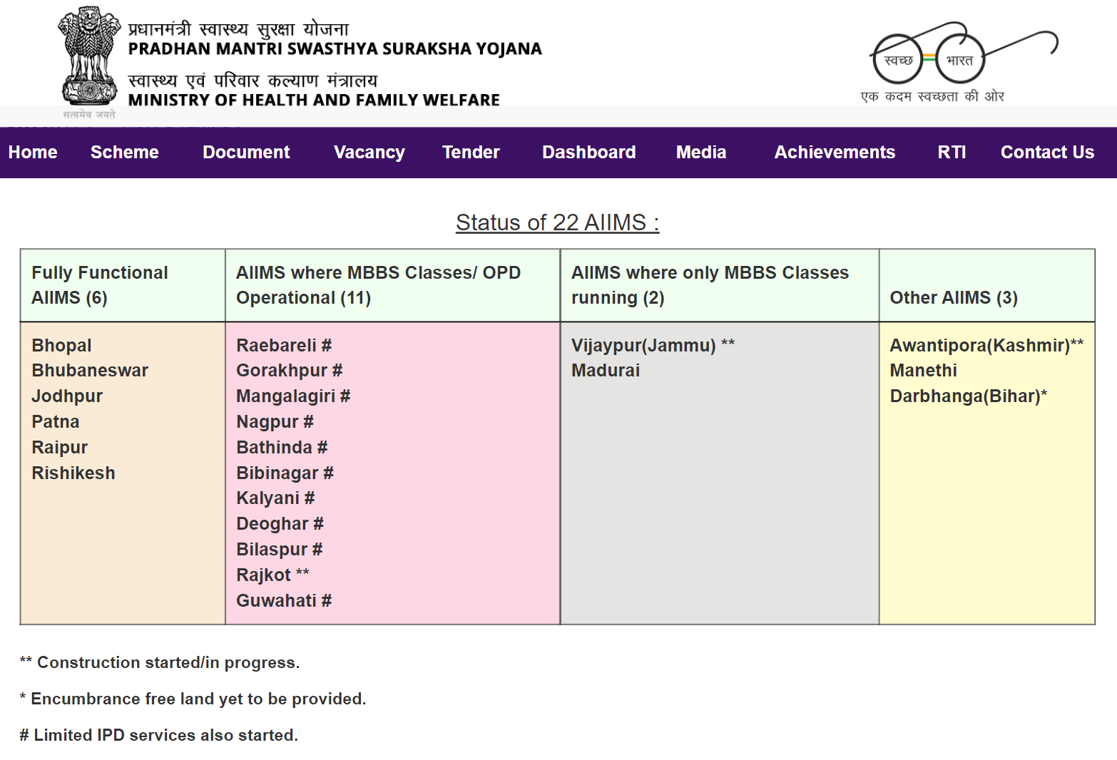 BiharAIIMS, Darbhanga1264048 months from date of handing over of encumbrance free land by State Government* Encumbrance free land has not been handed over by State Govt.