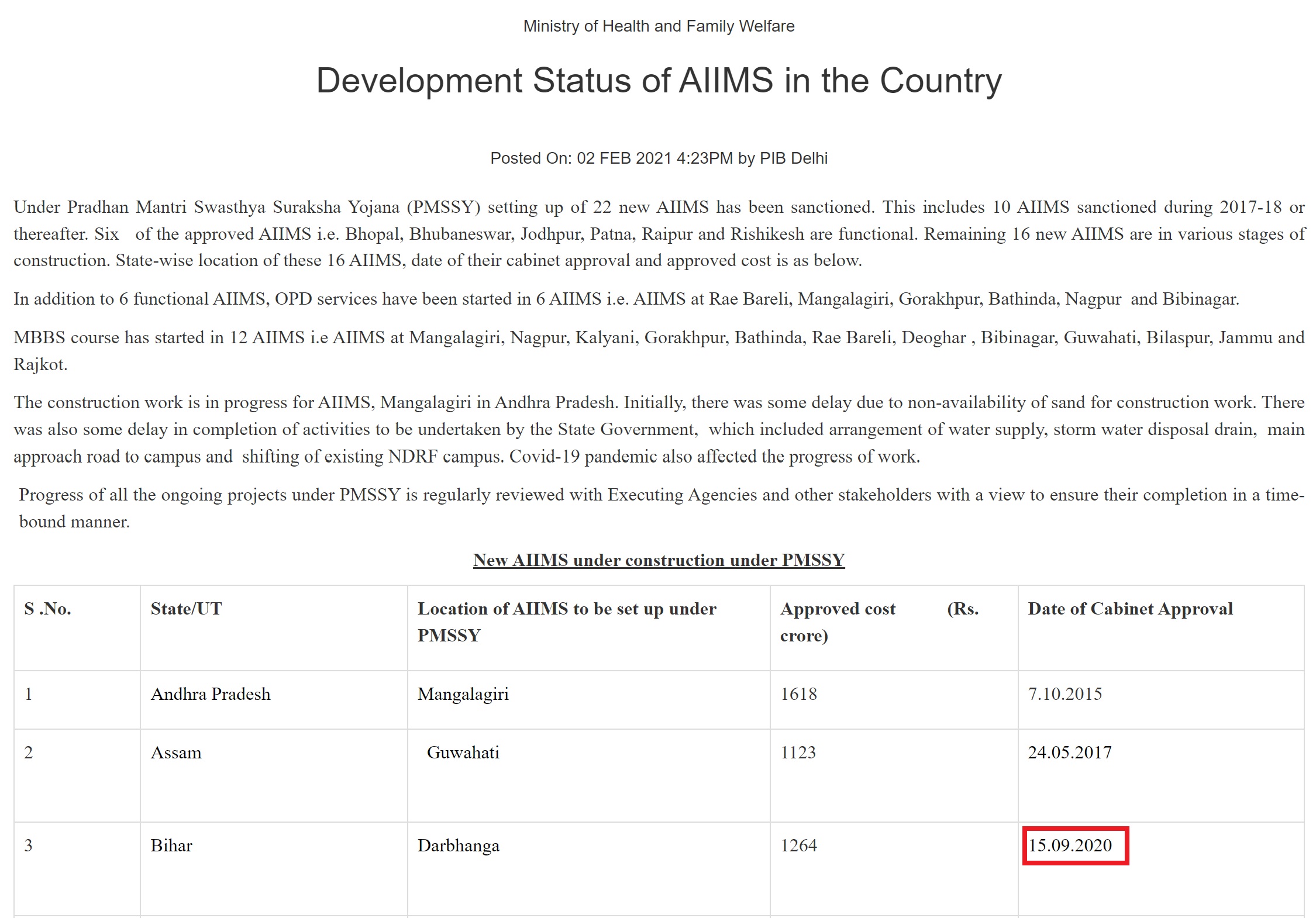 BiharAIIMS, Darbhanga1264048 months from date of handing over of encumbrance free land by State Government* Encumbrance free land has not been handed over by State Govt.