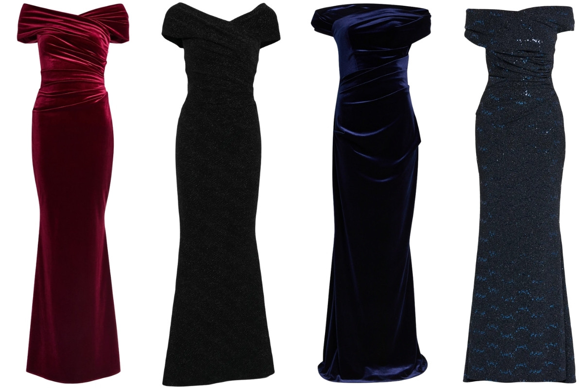 The gown’s crafted from a stretch velvet.