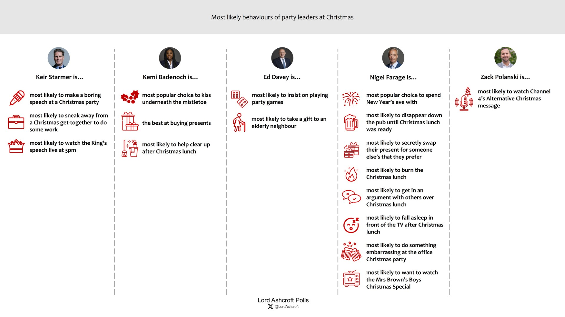 Nigel Farage was thought the most likely to disappear down the pub until Christmas lunch was ready. burn the lunch, get into an argument with someone over lunch, fall asleep in front of the TV after lunch, secretly try to swap their present for someone else’s that they preferred, watch the Mrs Brown’s Boys Christmas Special, and do something embarrassing at the office Christmas party. He was also the leader voters would most like to spend New Year’s Eve with (Zack Polanski coming a close second).