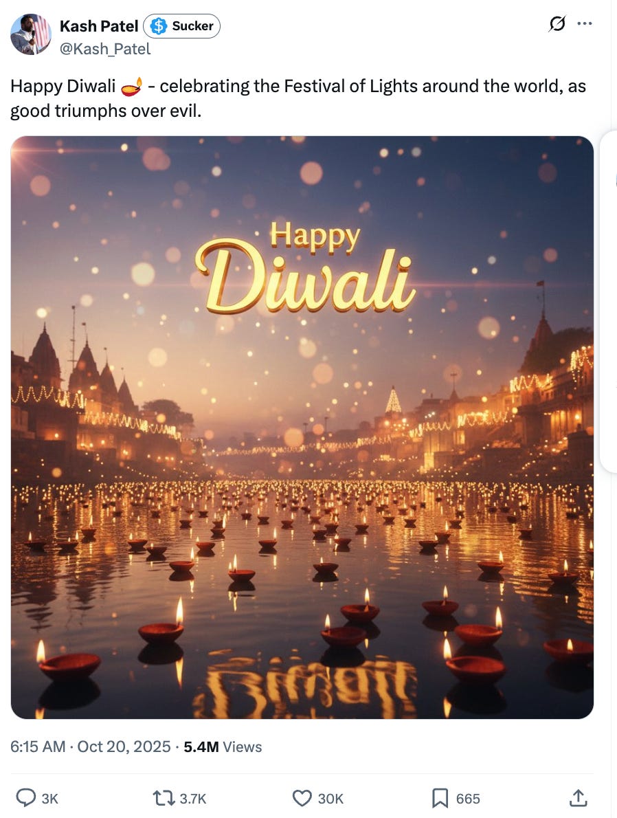 On Monday, Patel — who is Hindu — tweeted “Happy Diwali – celebrating the Festival of Lights around the world, as good triumphs over evil,” along with an illustrated “Happy Diwali” card depicting the Ganges river filled with lit candles. An innocuous post for those of us who are not insecure raging bigots.