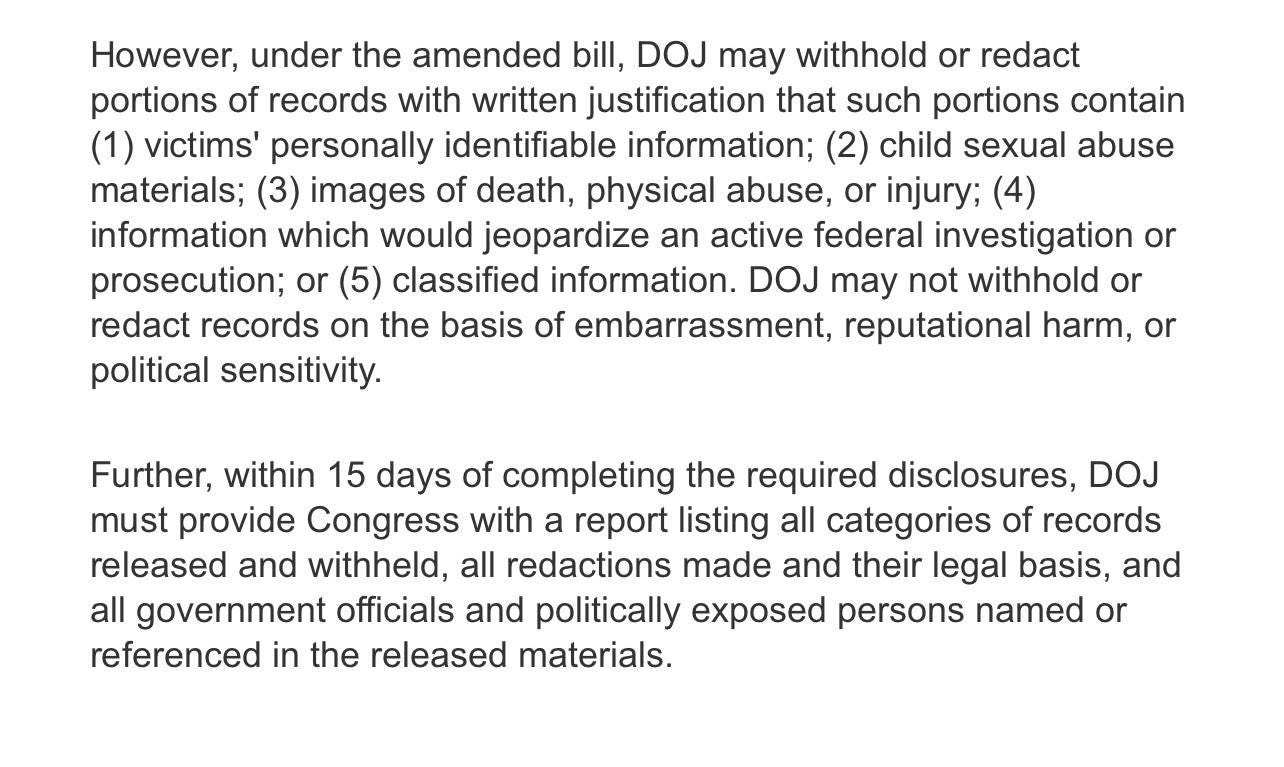 THEN, it says that within 15 days after handing the files the fuck over, DOJ “must provide Congress with a report listing all categories of records released and withheld, all redactions made and their legal basis, and all government officials and politically exposed persons named or referenced in the released materials.” (Emphasis ours.) Here is the pertinent text: