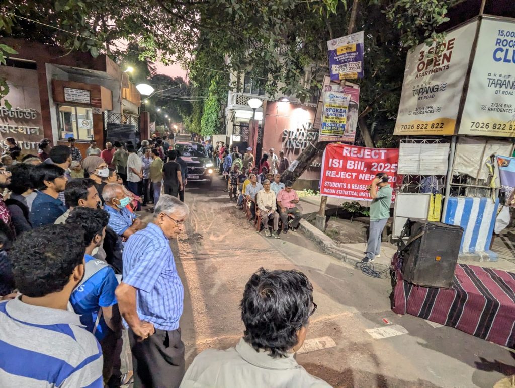 ISI Kolkata students and research scholars organized a meeting in protest against the proposed ISI Bill, outside the campus on B T Road on Wednesday. Photo: Special Arrangements
