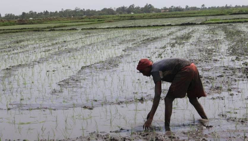 A farmer working in a rice paddy in the Mwea irrigation scheme which produces 70 per cent of Kenya’s rice. Credit: F. Makale / CABI.