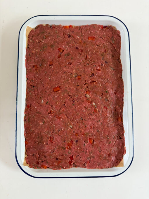 - Chop the onion and red pepper into very small diced pieces and add to the mince along with the garlic powder, smoked paprika, cumin, parsley and a little salt and pepper.