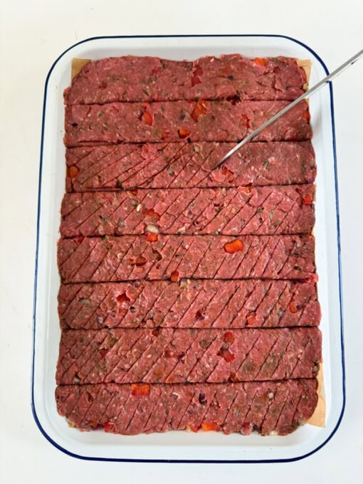 - Use a knife to cut the mixture into 8 strips then score each of the strips diagonally.