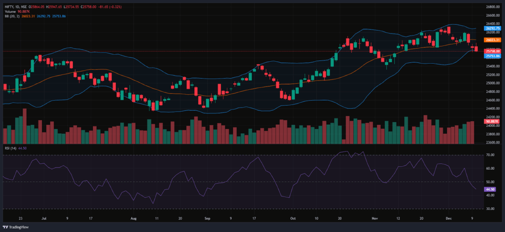 In the afternoon, the index showed a slight recovery but again failed to hold momentum, falling to its day low of 25,734.55 before settling just above 25,750. The Index traded within the broader range of 25,700 to 25,850 in the afternoon session. Finally, it had closed on a negative note at 25,758.00, down by 81.65 points, or 0.32%. In the short term, the Index dropped below the 13- and 20-day EMA, indicating a short-term bearish outlook in the daily time frame.