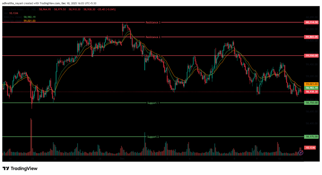 The nearest resistance is at 59,550 (R1) and 59,865.05 (R2). The higher resistance is at 60,114.30 (R3), which is the all-time high for the index. On the other hand, the closest support is now at 58,750 (S1), and the next support is at 58,175 (S2), where the index has taken support at this level previously.