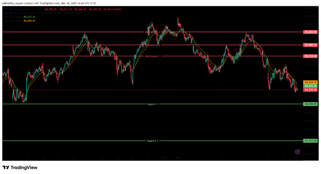 The index faces immediate resistance at 85,210 (R1) and 85,486.34 (R2). The higher resistance is at 85,805 (R3), a level near its all-time high. On the downside, the nearest support lies at 84,028.05 (S1) and the next one at 83,125.00 (S2).