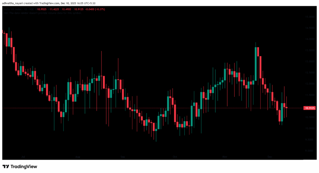 The India VIX fell to 10.91, down by 0.04 points (0.37%) during Wednesday’s trading session, indicating a slight downtrend in expected market volatility in the daily time frame. However, overall volatility remains low, since the India VIX is generally considered elevated only when it rises above 15.