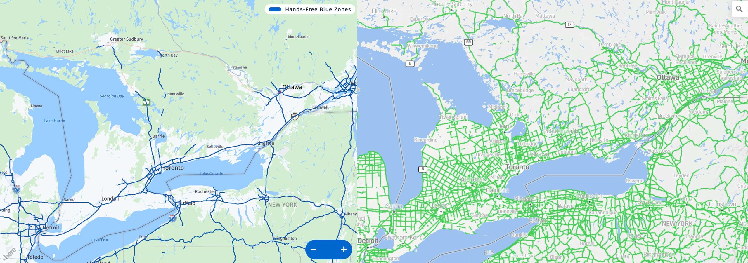 Ford’s mapped roads are on the left and GM’s are on the right.