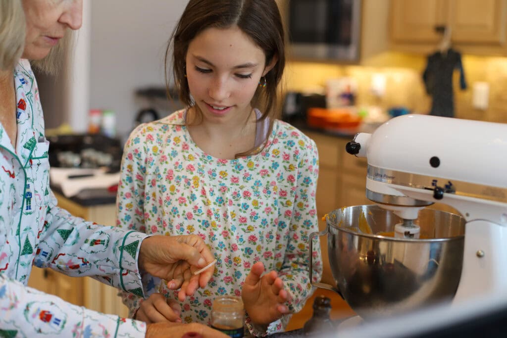 We were all excited Wednesday morning because my brother and his crew were up and on their way bright and early. While the girls and their cousins immediately took off to catch up and play, the rest of us got to work baking pies, getting the components prepped for Nannie’s stuffing (Kris took this one on which I admired because it’s an old fashion family recipe with directions like “one can of broth” and no real measurements), setting up tables, and dry brining the turkey.