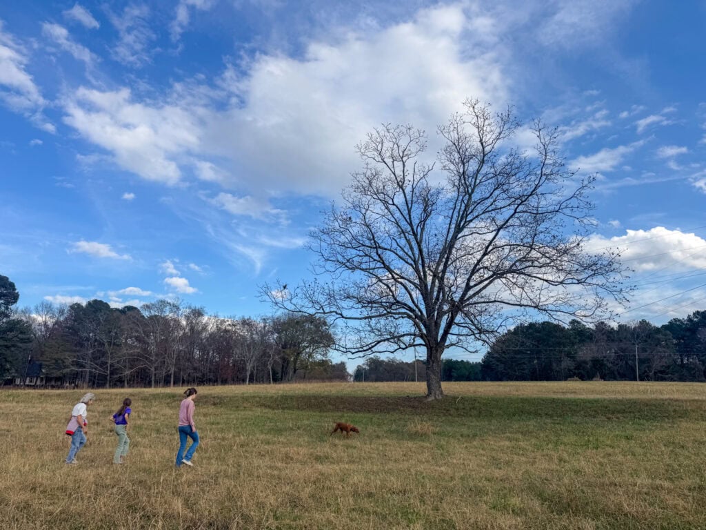 The girls and I headed down to Georgia on Monday and met mom at her property. When my Nannie passed away last year her cozy home and acreage in rural Georgia was split between mom and her siblings. While they sold the house (to a really nice couple which eased the ache of realizing it’s no longer Nannie and Pawpaw’s farm), mom is holding onto her 35+ acres of beautiful meadow, woods, and creek that also holds the family pecan tree, from which Nannie gifted us shelled, frozen pecans from each year. We walked the property, chatted with my uncle (who lives adjacent), and picked up pecans. It was really nice to have a little of our traditional Thanksgiving feel in a year in which we are starting a new tradition.