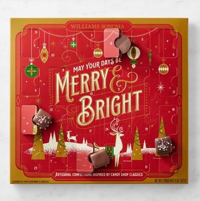 Here’s one more Williams Sonoma offering: Their classic candy advent calendar, an ideal choice for the chocolate aficionados on your list. Made with Fair Trade USA certified chocolate, the assortment has five peanut butter cups, five milk chocolate caramels, five dark chocolate caramels, five sticky paw squares, and four peppermint truffles. (Anyone else drooling?) The box is a bright, festive red with a cute but classy Christmas scene. This advent calendar is $39.95.