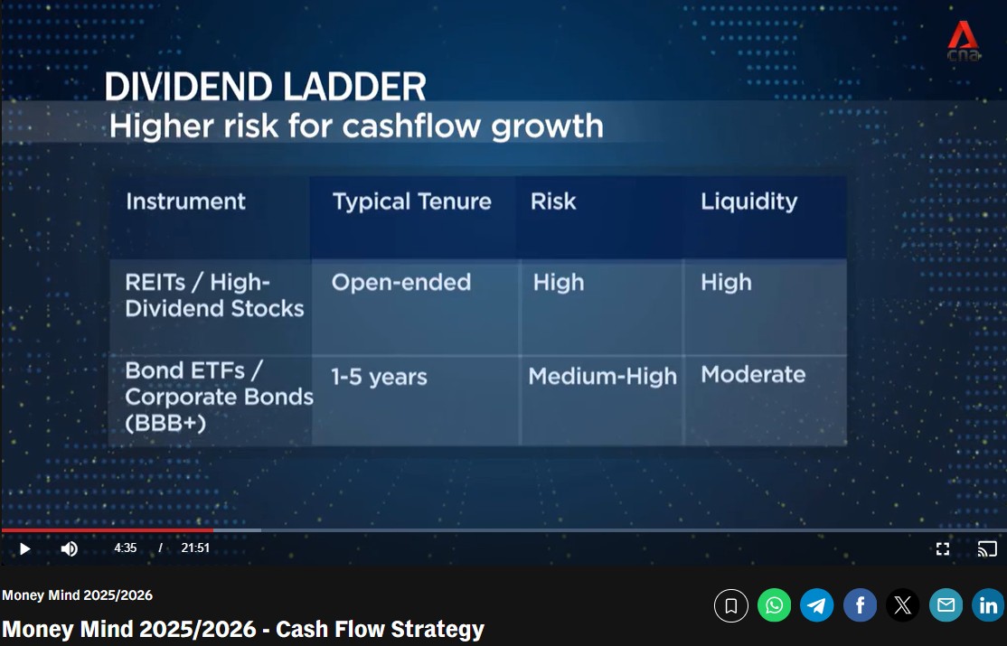 - How it works: By tracking the payout dates of different assets, you can set up a rhythm to receive cash flow almost every month. A 5% yield on a S$50,000 portfolio can generate about S$2,500 a year.