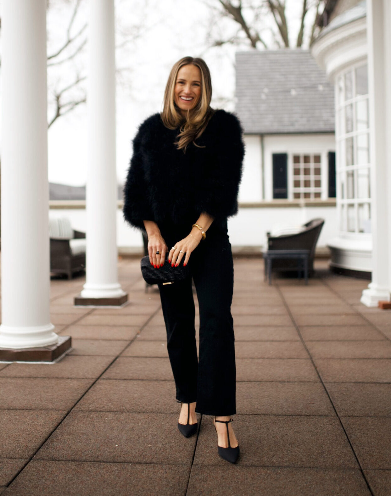 The key to wearing black jeans for a dressy outfit is to make sure your jeans are a polished black wash. An almost-black-grey wash naturally looks more casual, so I recommend a pair of pure black jeans (preferably without distressing) for a timeless, dressy outfit.