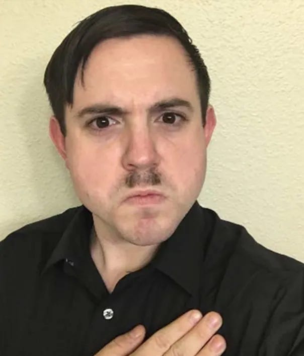 And Martin had slobbered praise upon and given a “patriotism” award to Timothy Hale-Cusanelli at Trump’s New Jersey golf course and wife cemetery, and had him on his podcast multiple times. Hale-Cusanelli is the rabid antisemite rioter who posted a picture of himself looking like this: