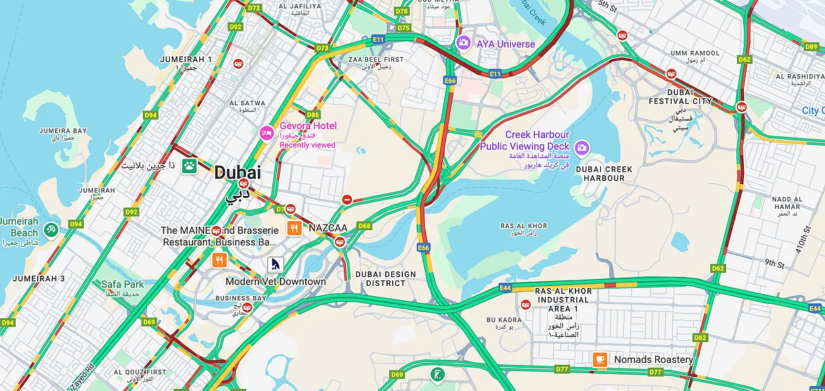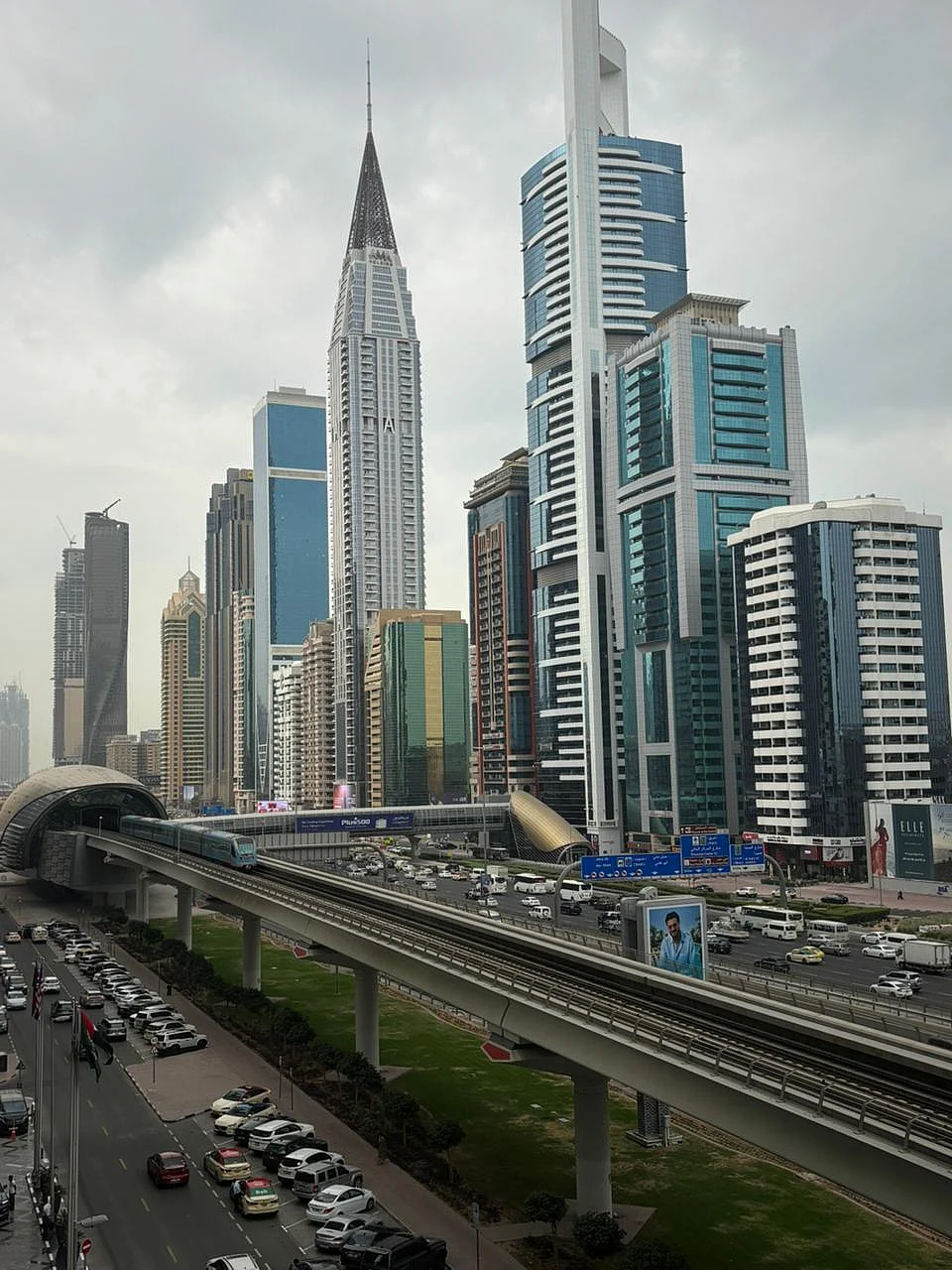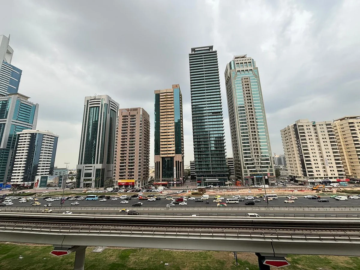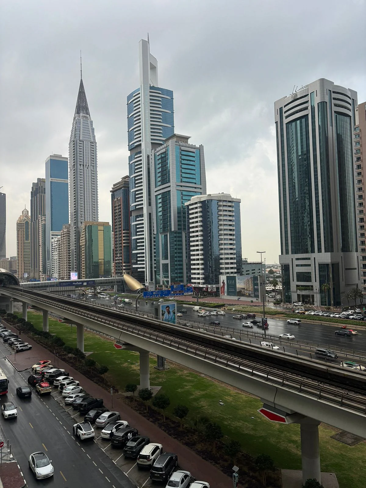 On Sheikh Zayed Road, which sees heavy traffic during the morning and evening peak hours, the roads are dry with a grey overcast above.
