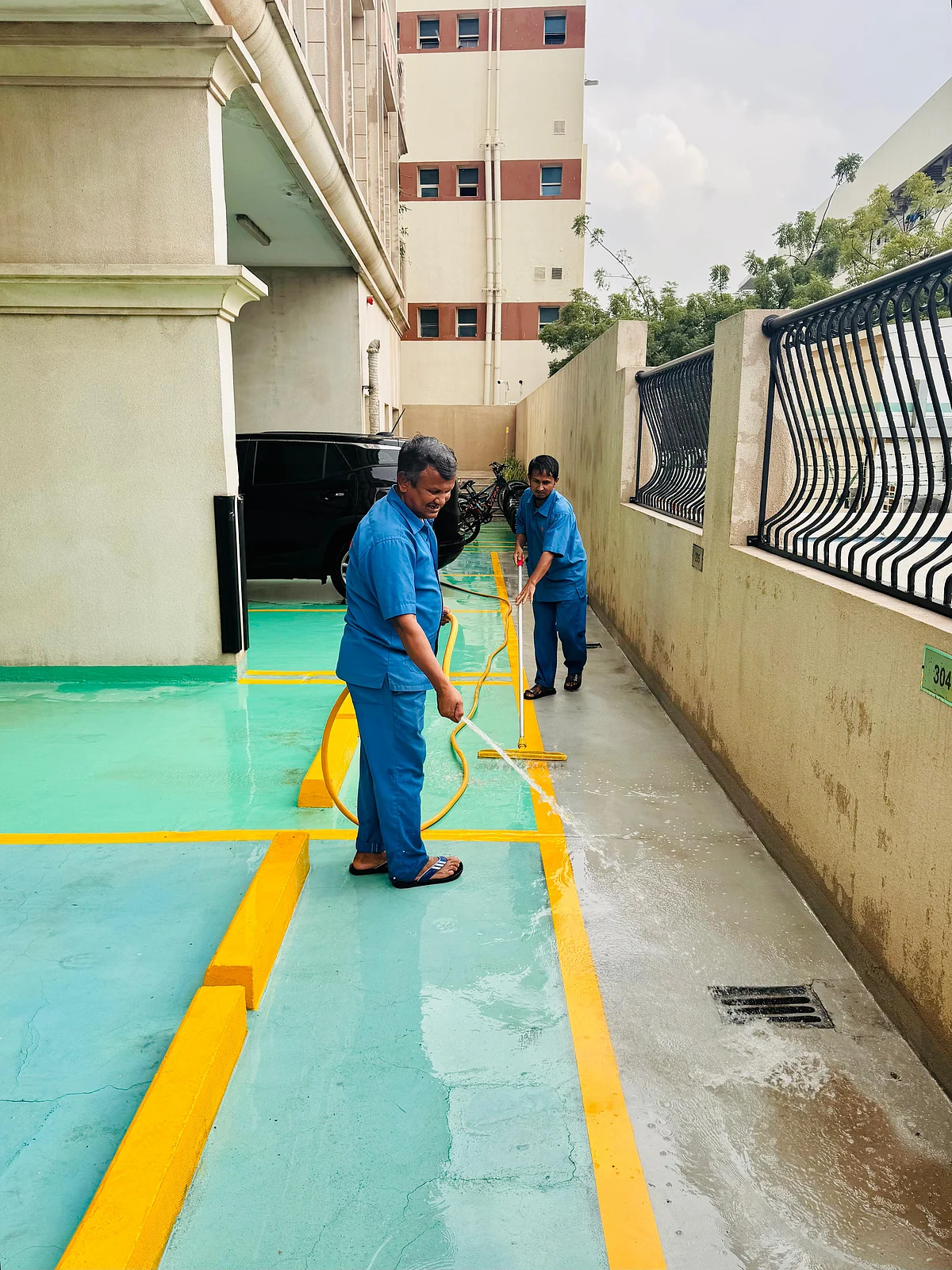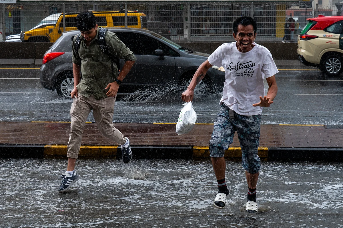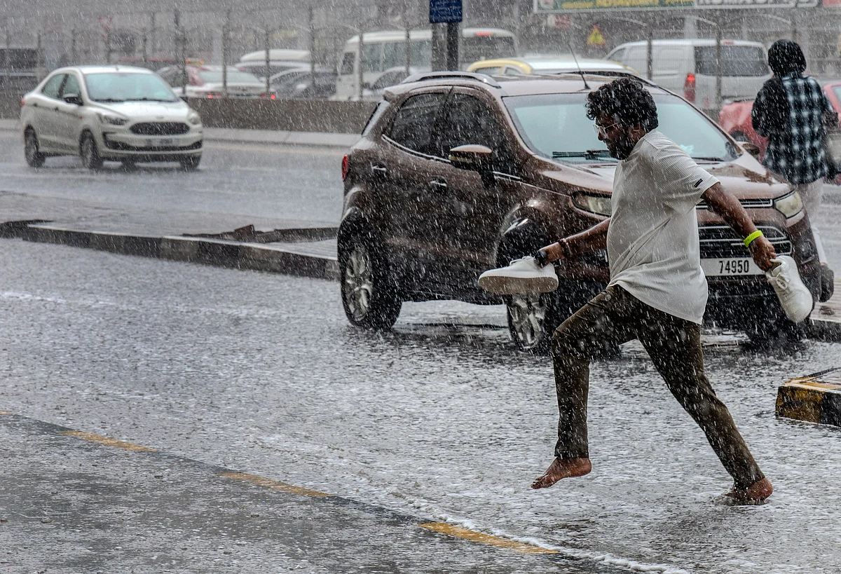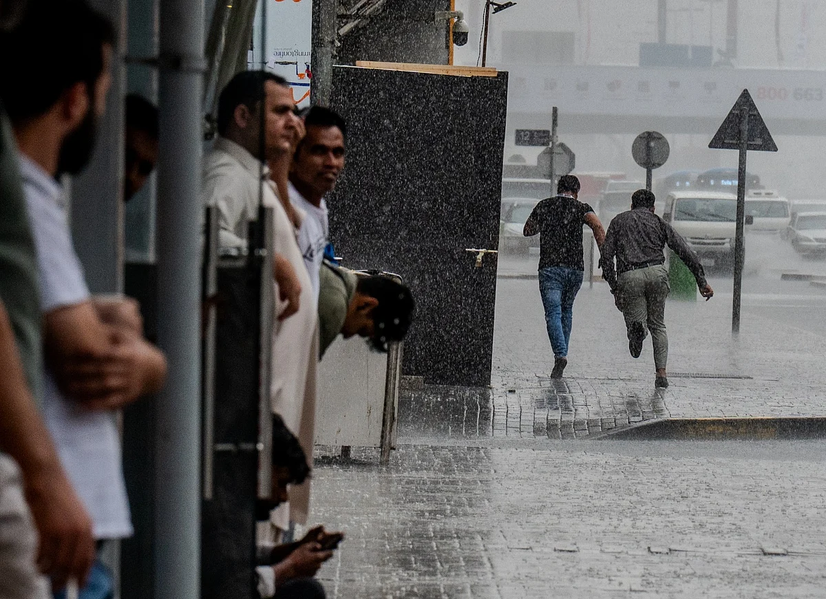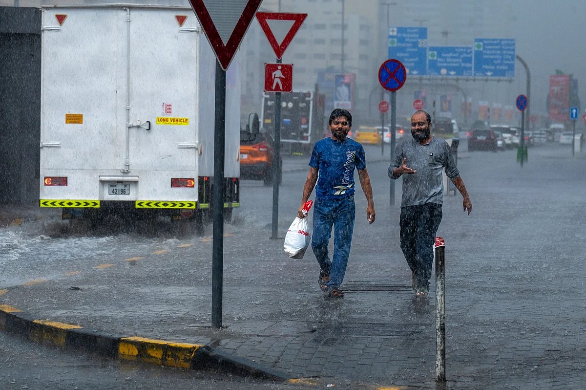 As heavy rain sweeps through Dubai, maintenance workers at a building in Al Quoz move quickly to drain water and prevent flooding.