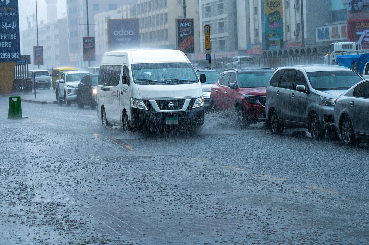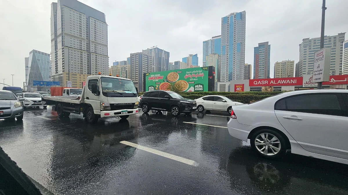 Rains in parts of Sharjah got heavier, with congestion rising on roads as cars slowed down to maintain safe distance, while residents made their way inside.