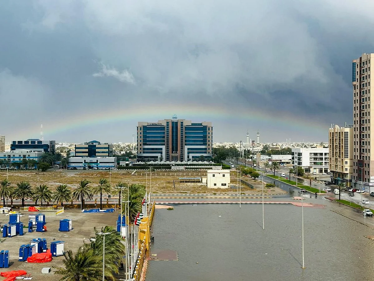 A rainbow stretches across the skyline as floodwaters cover parts of Nakheel in Ras Al Khaimah following heavy rainfall, creating a striking contrast between dark rain clouds and the sunlit city.