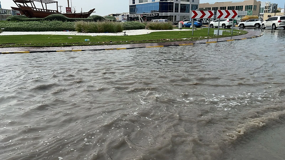 Some cars are seen braving the flooded service road on the corner of First Al Khail and Latifa bin Hamdan streets, after heavy rains left the area waterlogged.