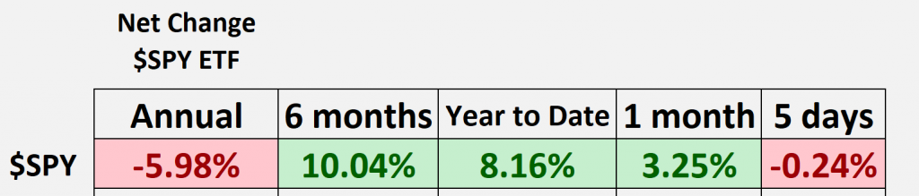 So as we typically do, we’ll look at the SPY, the S&P 500 ETF. We can see since the VantagePoint forecast started, forecasting this market to go to the upside, we’re up about 4.9% over the past 23 trading days. But as we take a broader look at the markets, we can see that over the past 12 month period, we’re still actually down about 6%. We’ve had a really nice rally at the beginning of the year, shares up about 8%, but again, much of that just coming in over the past month. And more recently, we’ve run sideways. That’s what I really want to highlight is how VantagePoint traders can get ahead of that strength coming in, but also identify those shifts in the marketplace and get ahead of that as well so they can hedge the portfolio and really make the most of these trading opportunities.