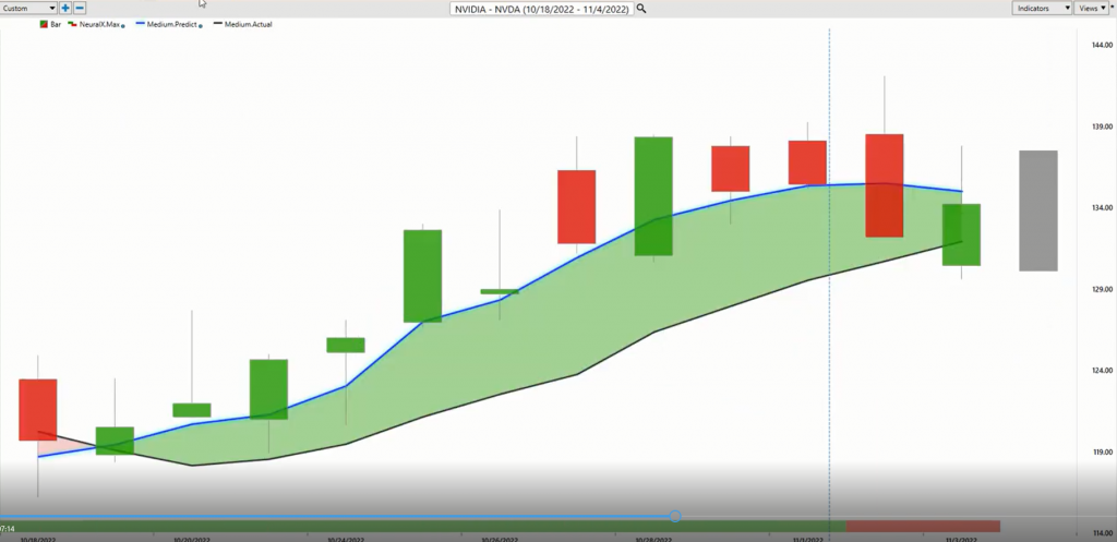 Here’s Nvidia. It’s a very popular company. Well, over the past couple of weeks, you’ve seen an Nvidia cross over to the upside. And look at all this strength from the neural index, the blue line over the black line, and then we can look at those predicted highs and lows. So traders who have these tools understand that, hey, down here at 120, that’s a good opportunity in Nvidia. The next trading day, 121 or so, right, here on this gap down. Right here. Here’s actually the Fed day and you see that the market goes right to that previous predicted low. And then you see pretty much filling that predicted range almost perfectly the next trading day.