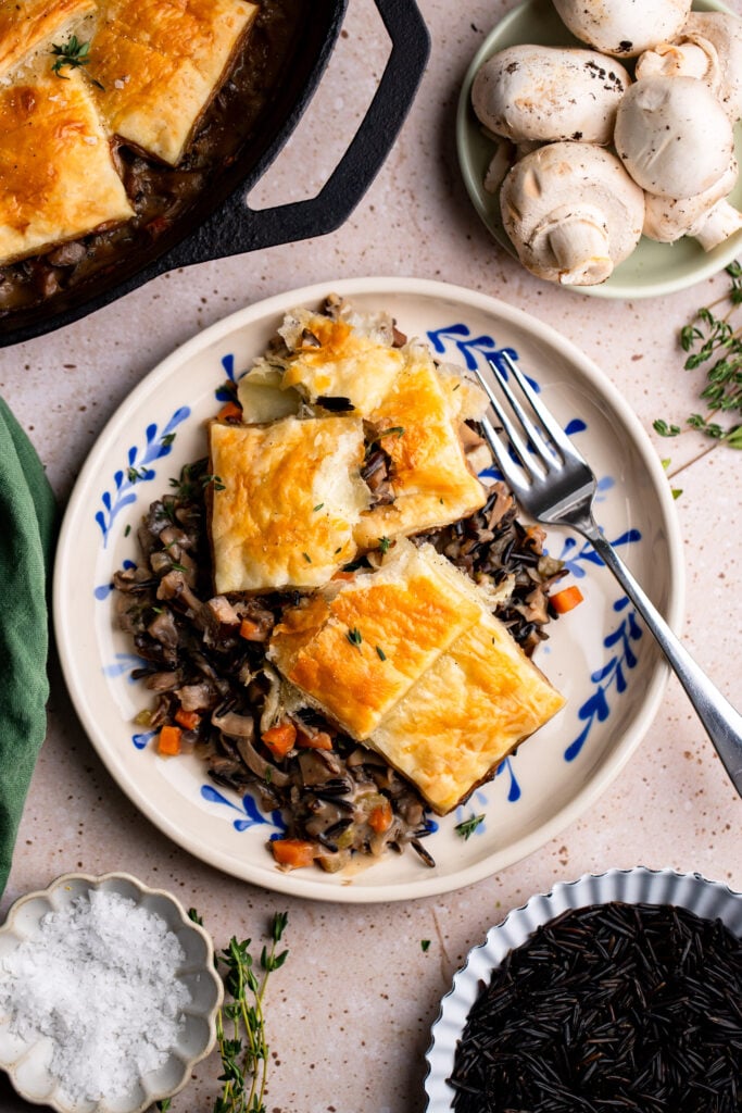 A hearty and filling recipe to add to your rotation this cozy season. This vegan mushroom pot pie delivers on flavor with a filling made from mushrooms and wild rice topped with crispy puff pastry.