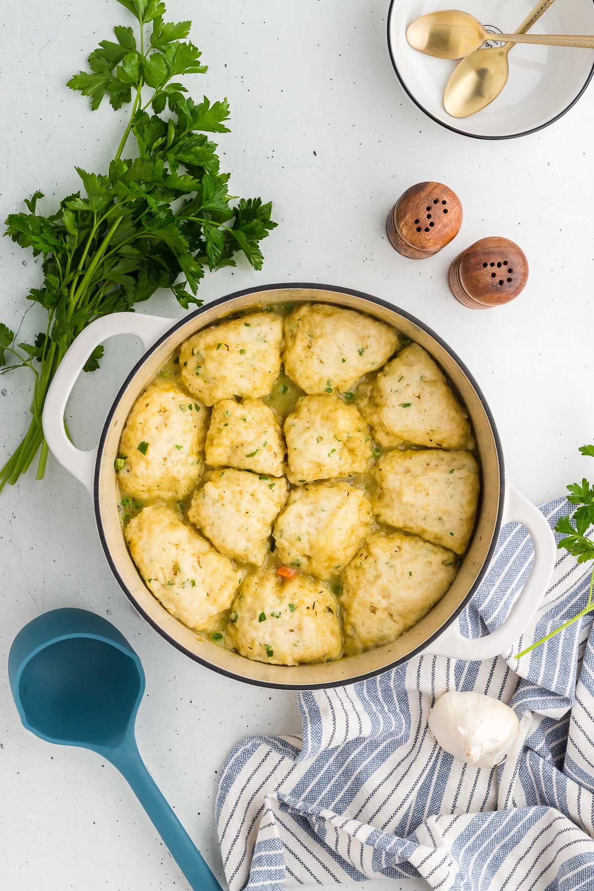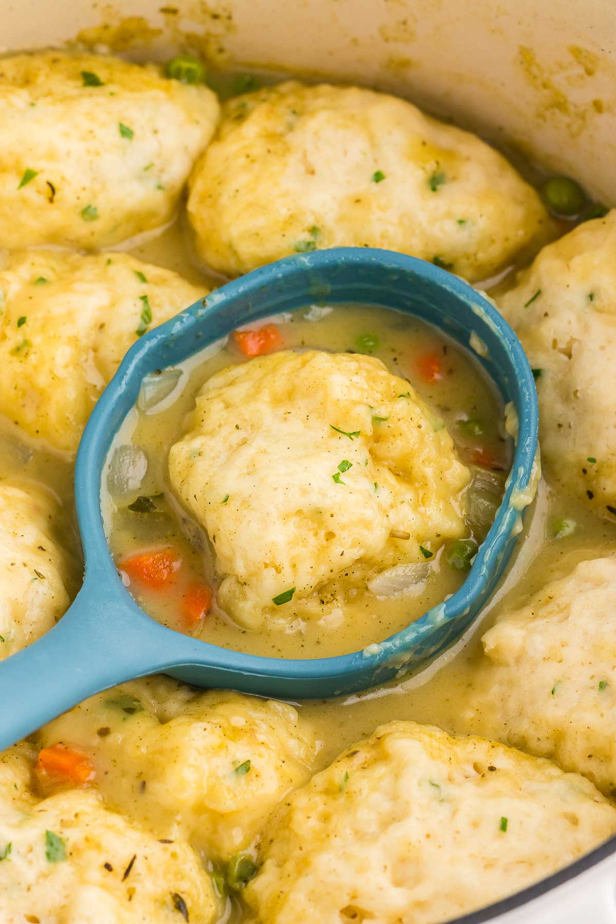• Don’t over-mix the dumplings: If you stir them too much, you risk developing the gluten in the dumplings which can make them tough instead of fluffy and tender.