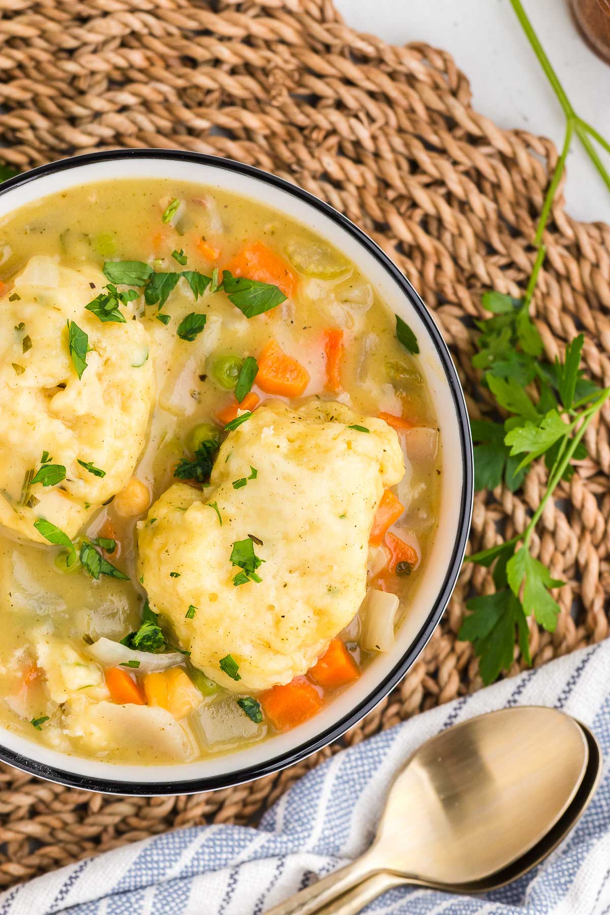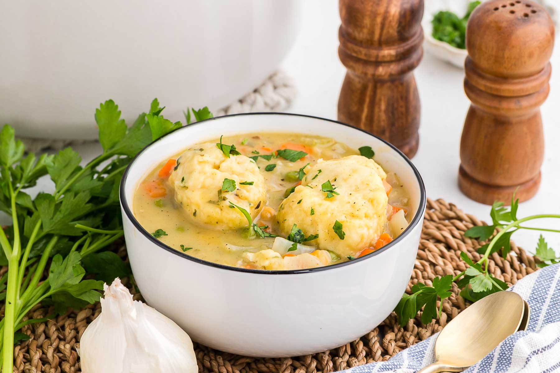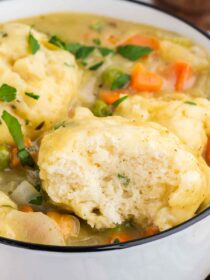 • Amazing leftovers! – I love to enjoy a second serving for lunch the next day or easy dinner later on in the week. The dumplings hold up surprisingly well – just a quick covered simmer on the stove and it’s comfort food part two!