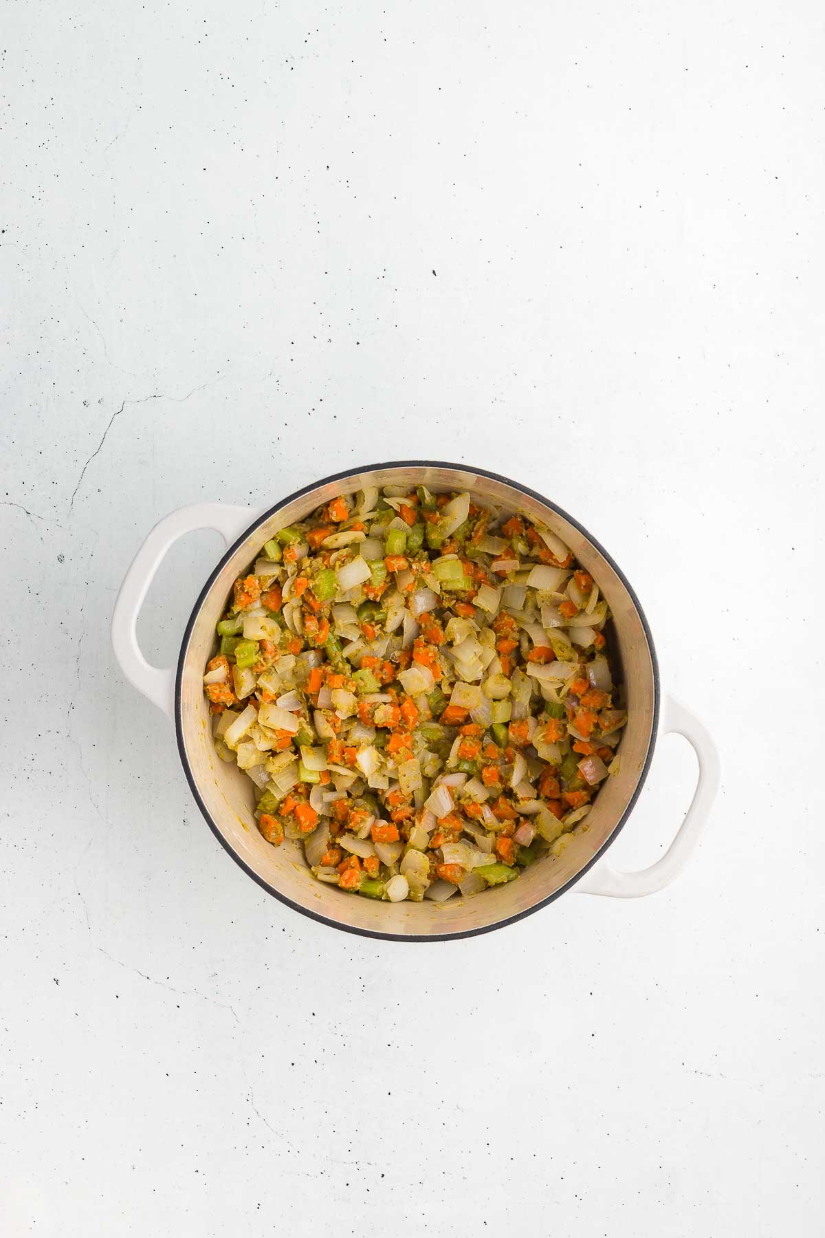 • Place a medium or large Dutch oven or soup pot over medium-low heat. Add the butter and olive oil. When warm, add the onion, carrots, celery, and garlic. Sweat the veggies until tender and soft, about 8 minutes. If the vegetables begin to brown, lower the heat – you only want to sweat them.